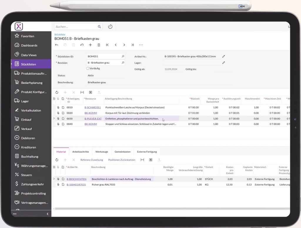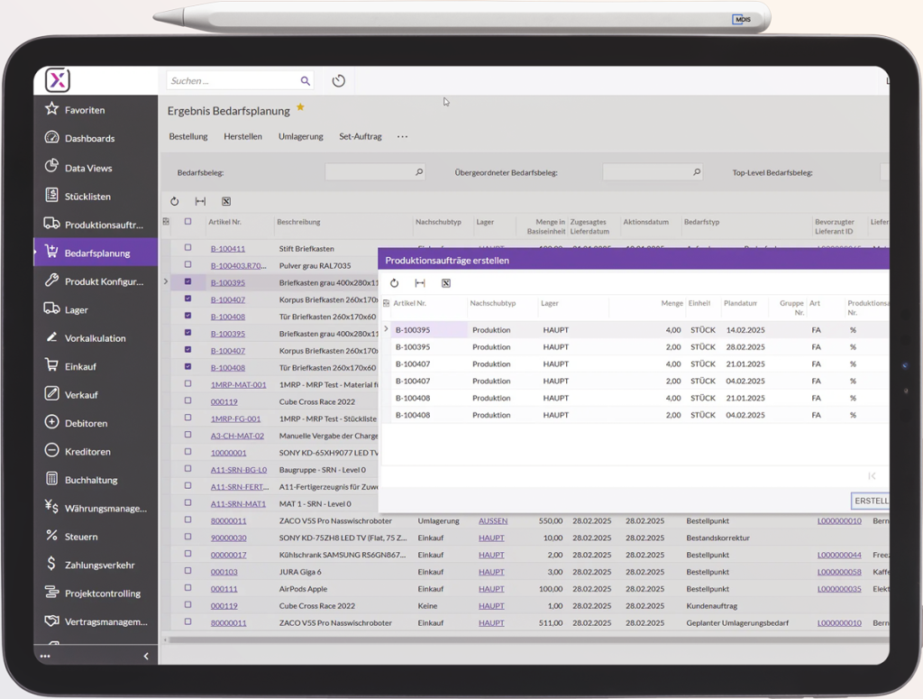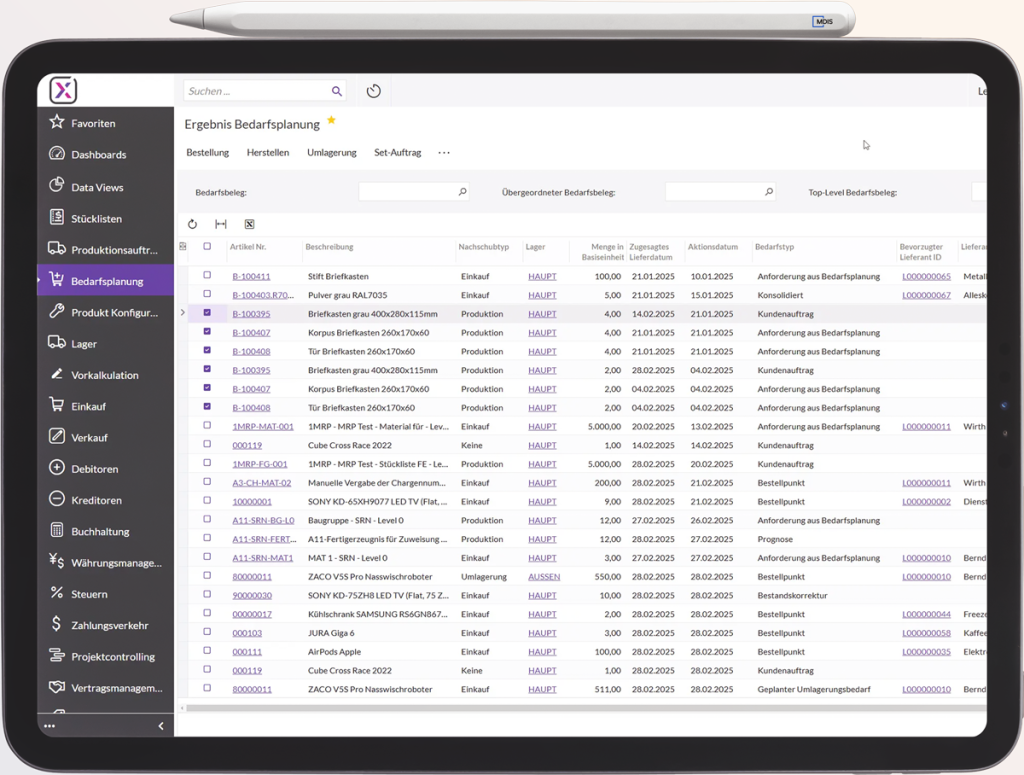 Sichern Sie die optimale Versorgung Ihrer Produktion mit Materialien und Komponenten. Das MRP-Modul berechnet Bedarfe automatisch auf Basis von Produktionsplänen und Lagerbeständen und sorgt so für eine termingerechte und mengenoptimierte Verfügbarkeit.